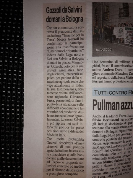 Con una nota il Presidente dell’Associazione no profit “Insieme per la Terra” Dr. Nicola Gozzoli ha confermato la partecipazione alla manifestazione “Liberiamoci e ripartiamo” indetta dalla Lega Nord e Noi con Salvini a Bologna domani 8 novembre. Gozzoli, noto per la sua attività associativa fuori degli schemi delle grandi organizzazioni sindacali agricole e per tener costantemente i politici “alla porta”, interverrà sul palco per parlare della situazione agricola reale che vige attualmente in Italia; la sua testimonianza, frutto di anni di attività associativa lungo tutto lo stivale, permetterà di fare il punto della situazione sulle difficoltà economiche e lavorative dei produttori delle nostre eccellenze agroalimentari. L’atteso intervento del Presidente, fortemente voluto dall’Assessore Regionale all’Agricoltura Gianni Fava è stato avvallato direttamente dallo stesso Salvini che a più riprese nei suoi interventi politici ha preso posizioni nette a difesa del Made in Italy. Con molta probabilità Gozzoli non solo descriverà in breve…