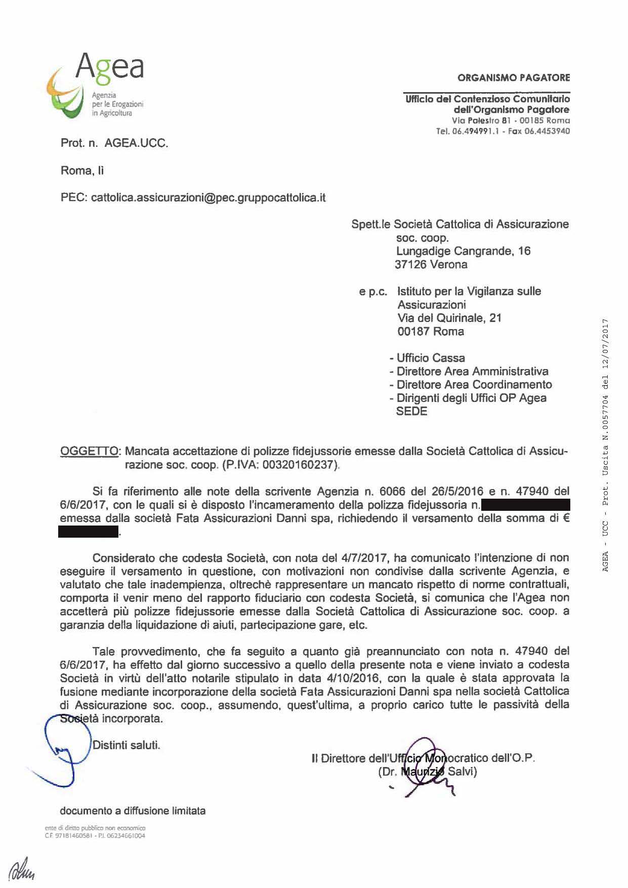 Dopo la pubblicazione di queste informazioni su Il Fatto Quotidiano, Agea ha deciso, come rivelato da Agricolae, di non accettare alcuna fidejussione emessa dalla Cattolica Assicurazione.