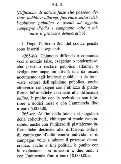 Chiunque diffonde o comunica voci o notizie false, esagerate o tendenziose, che possono destare pubblico allarme, o svolge comunque un’attività tale da recare nocumento degli interessi pubblici o da fuorviare settori dell’opinione pubblica, anche attraverso campagne con l’utilizzo di piattaforme informatiche destinate alla diffusione online, è punito con la reclusione non inferiore a 12 mesi e con l’ammenda fino a euro 5.000,00.