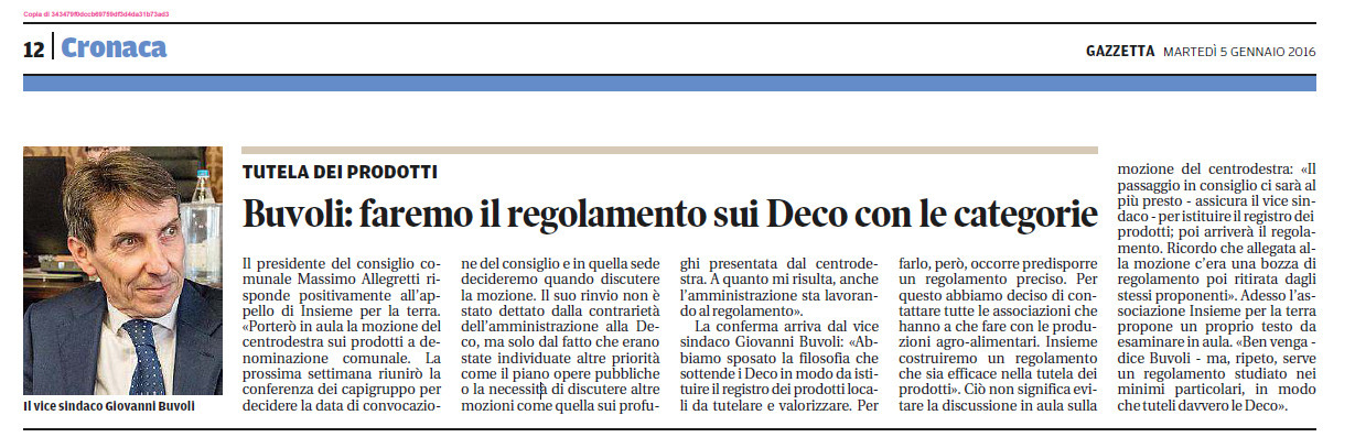 Tutta l’Associazione di Insieme per la Terra manifesta vivo ringraziamento al Presidente Allegretti per aver accolto l’appello di portare urgentemente in aula il “Regolamento per la tutela e valorizzazione dei prodotti tipici locali e per l’istituzione della De.C.O.” da noi presentato grazie alla mozione della minoranza; avevamo il forte timore che il nostro progetto fosse stato dimenticato ed archiviato nelle cantine di Via Roma.