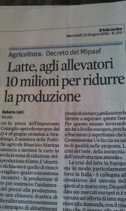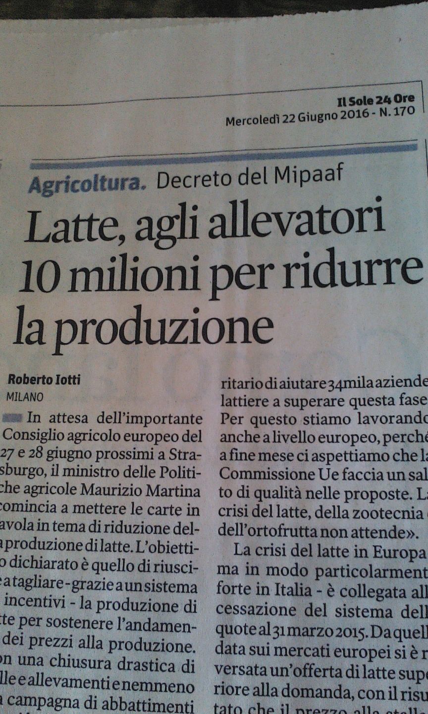 Il caso del latte pubblicato sul Sole 24 Ore, dai noi anticipato con un articolo dal titolo “UE: troppo #latte, meglio abbattere i #bovini. Poche ore al via libera“, è assolutamente emblematico. Invece di proporre soluzioni a medio – lungo termine il Ministro Martina ha messo sul tavolo un premio di 10 milioni per chi riduce la produzione ed altri 10 milioni per acquistare formaggio per gli indigenti. Considerato l’elevato numero di Allevamenti in Italia queste misure non sono nemmeno utili per pagarsi un caffè al bar.
