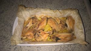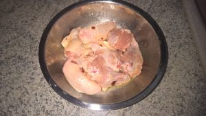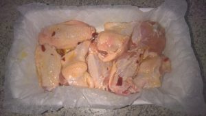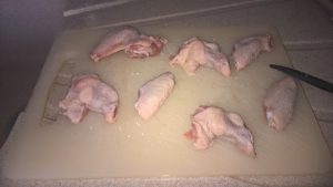 - Prendiamo 4 alette di pollo, le laviamo, controlliamo con attenzione che non sia attaccata ancora nessuna piumetta (in quel caso possiamo eliminarla con la pinzetta o bruciarla sul gas del fornello) e le tagliano ognuna in 2 parti.