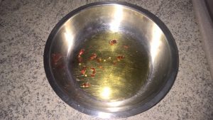 - In una ciotola abbastanza capiente versiamo l’olio extravergine d’oliva e ci tagliano i 2 peperoncini.
