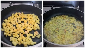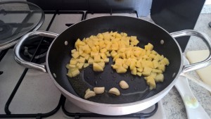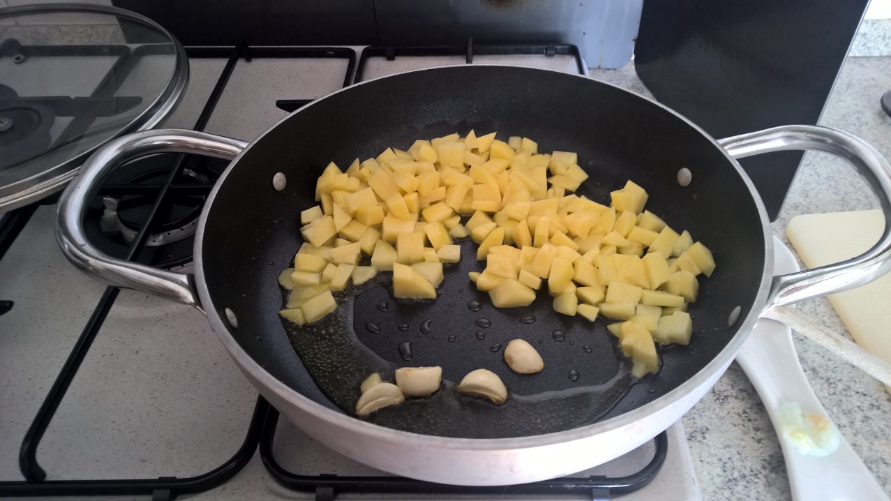 - In una casseruola soffriggete l’aglio con i dadini di patate.