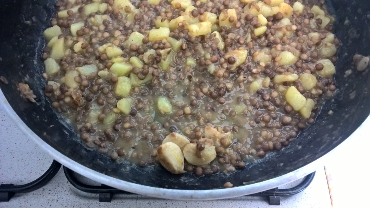 - Dopo circa 20 minuti le lenticchie e le patate saranno cotte, individuate l’aglio ed eliminatelo.