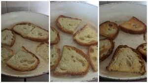 - In una padella fate sciogliere una noce di burro e friggete il pane pugliese in modo da ottenere dei bei crostoni per la vostra crema.