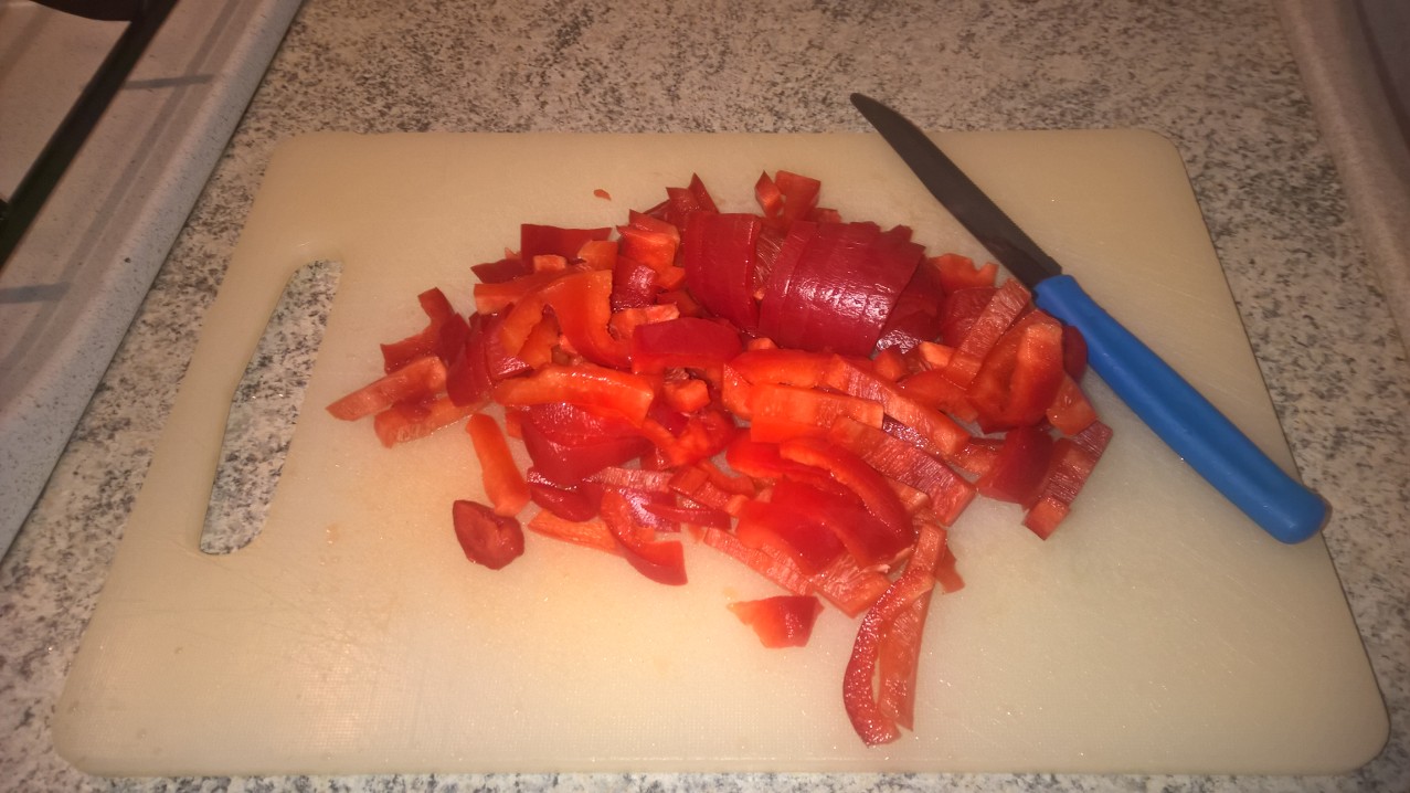 - Lavate, tagliate ed eliminate i semini e la parte interna bianca dai peperoni.