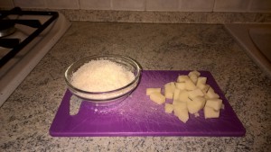 - Tagliate a dadini la fontina e grattugiate il Grana Padano.