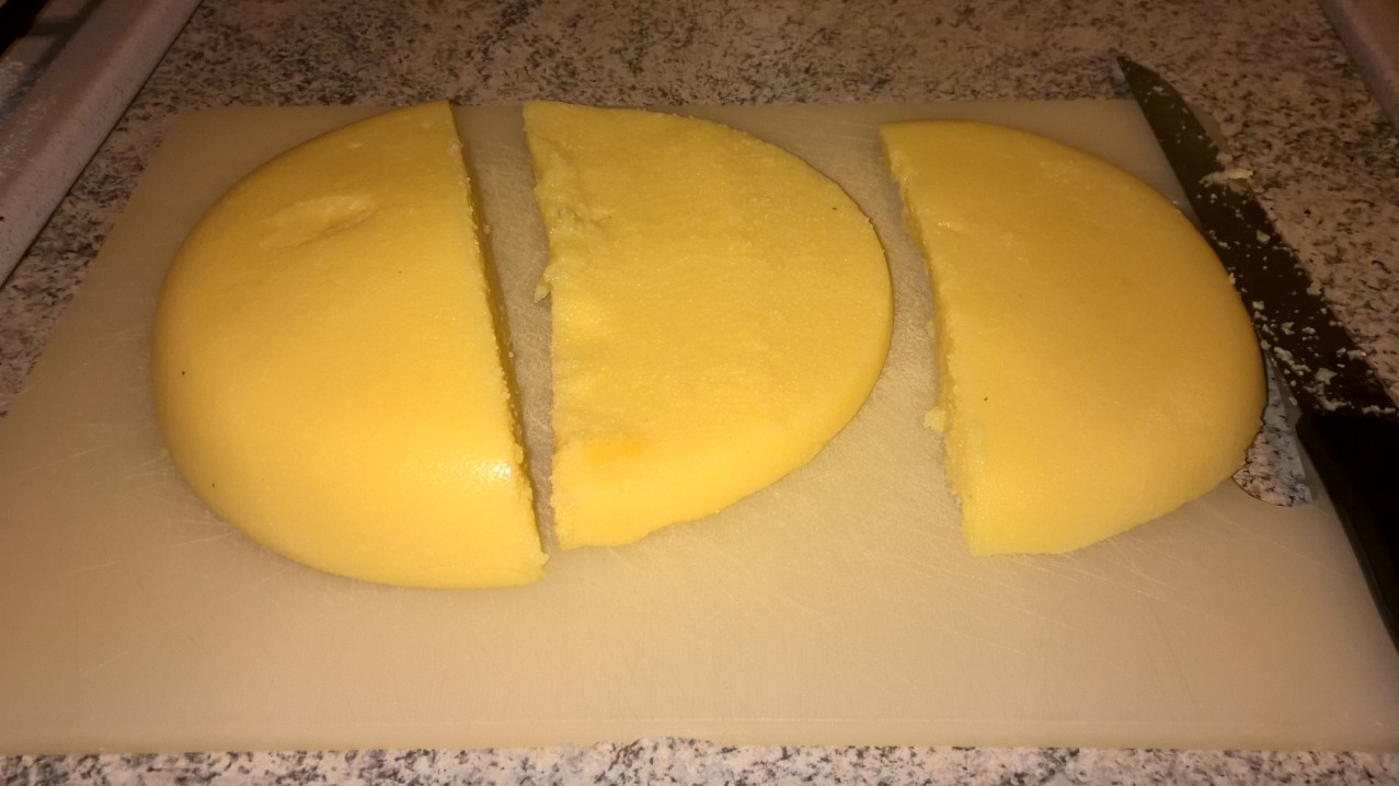 - Liberate la polenta dallo “stampo” e tagliatela a metà.