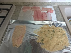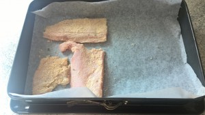 - In una teglia da forno posizionate la carta forno e adagiateci i filetti di persico impanati.