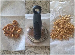 - Mettete i gherigli di noci tra due parti di carta forno e batteteli con il batticarne.