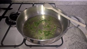 - In una casseruola mettere a soffriggere l’olio extravergine d’oliva con un trito di aglio e prezzemolo.
