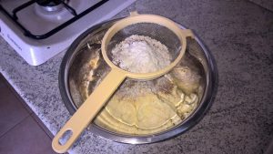 - In una ciotola abbastanza capiente versate il composto e, dopo averli setacciati, la farina, la maizena, il lievito e il cacao amaro. Amalgamate il tutto con un cucchiaio di legno.