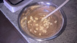 - Spezzettate 40 gr di cioccolato bianco e aggiungetelo al composto.