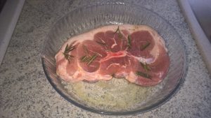 - Prendete un trancio di spalla di maiale e mettetelo a riposo in una pirofila con olio extravergine d’oliva, il rosmarino, l’origano, la maggiorana e un pizzico di sale fino. Lasciate riposare anche per un paio d’ore.
