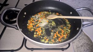 - In una casseruola mettete l’olio extravergine d’oliva e fate un abbondante soffritto con carota, cipolla e sedano.
