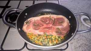 - Aggiungete la noce di burro ed il trancio di spalla di maiale. Fate rosolare per circa 5 minuti.
