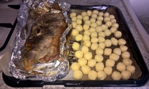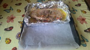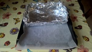 - Avendo deciso di aggiungere un contorno di patate, ho preparato una teglia forno in modo da usare la stessa per entrambe le cose e non permettere alle patate di sottrarre tutto il liquido di cottura alla spalla. Pertanto ho steso la carta forno e con la carta stagnola ho preparato uno contenitore nel quale adagiare il trancio di spalla di maiale.