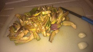 Uso sia il carciofo che i gambi. E’ un peccato buttarli via, anche perché il sapore è simile al cuore del carciofo.