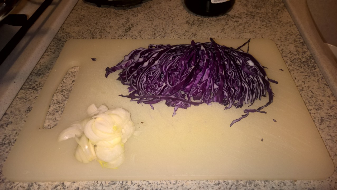 - Tagliate il cavolo cappuccio e la cipolla finemente.