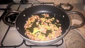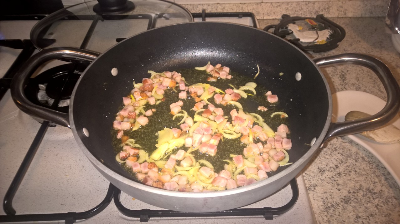 - Dopo pochi minuti aggiungiamo la pancetta affumicata tagliata a dadini.