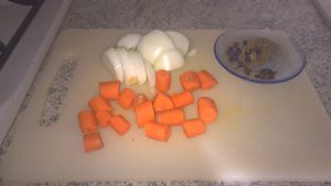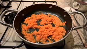 - Versate nella casseruola 4/5 cucchiai d’olio extravergine d’oliva e mettete a rosolare il trito di cipolla e carota.