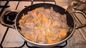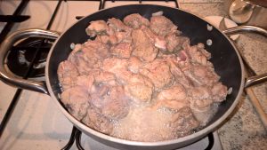 - Dopo qualche minuto aggiungete i cubotti di cinghiale, fate insaporire per circa 10 minuti.