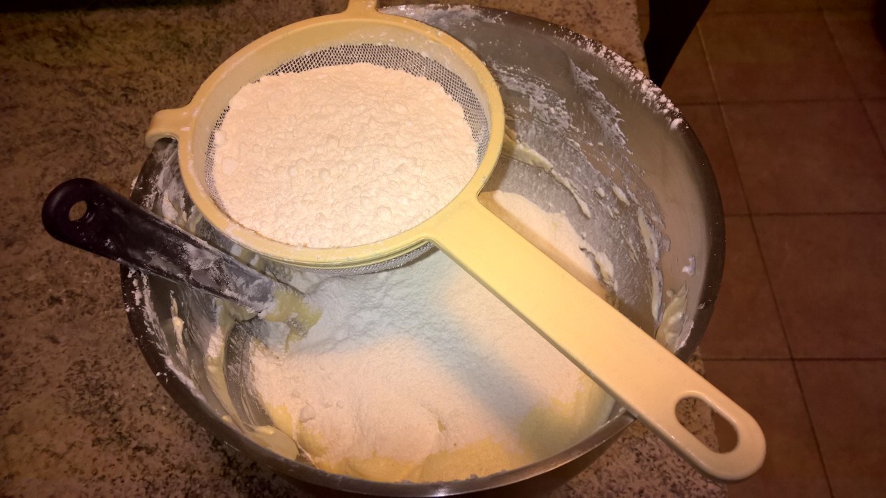 6. Aggiungete, dopo averli setacciati: la farina, la maizena e il lievito. Continuate a mescolare sempre dall’alto verso il basso.4