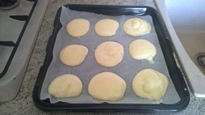 - Prendete una placca da forno, stendeteci sopra della carta forno e versate, aiutandovi con un mestolo, 8/9 porzioni di composto, cercando di mantenere il più possibile una forma circolare e cercando di distanziare il più possibile le porzioni.