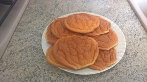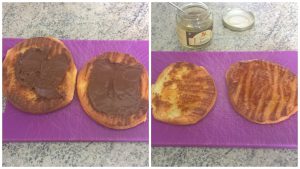 - Cercate di individuare le frittelle più simili per forma a due a due e preparatele per farcirle. Io ho usato la crema alla nocciola ed il miele d’acacia.