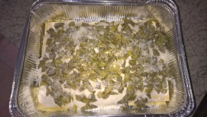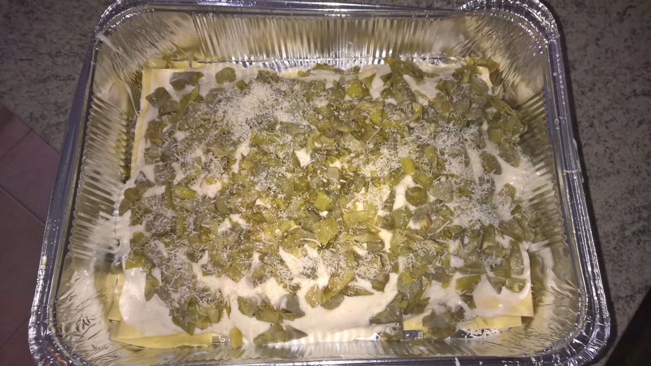 - Mettiamo il primo strato di lasagne, i carciofi, la besciamella e una spolverata di Grana Padano.