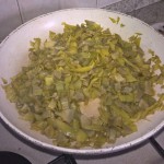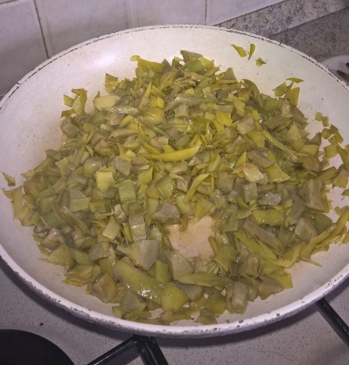 - Tagliare i carciofi e i gambi in piccole parti e appena l’olio inizia a friggere, aggiungerli in padella. Sfumare con il vino bianco e lasciarli cuocere per circa 10 minuti aggiustando di sale e pepe. Se durante la cottura notate che i carciofi si stanno asciugando, aggiungete un po’ d’acqua tiepida.