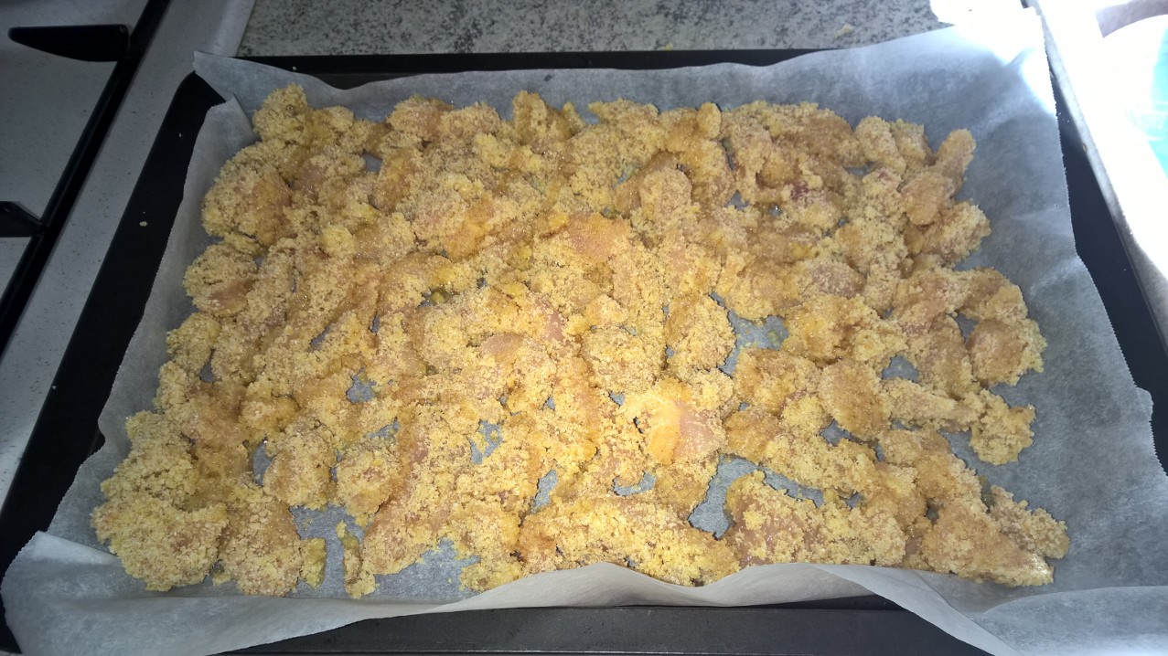 - Disponete il tutto su una placca da forno, ricoperta da carta forno, cercando di sovrapporre il meno possibile le listarelle di pollo.