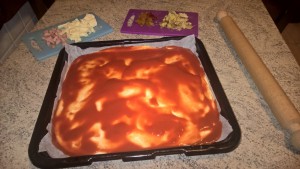 - Cospargetela con la passata di pomodoro (compresi i bordi) e la mozzarella.