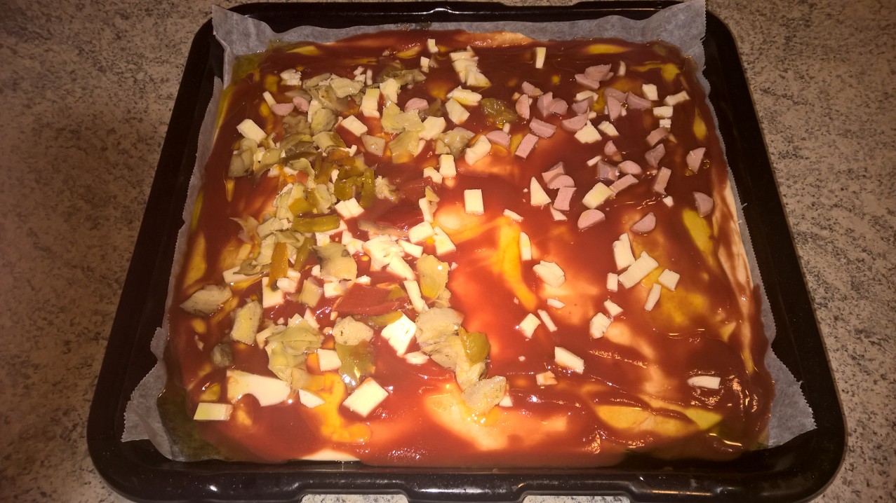 - Spostate la pasta della pizza con la carta forno su una teglia rettangolare.