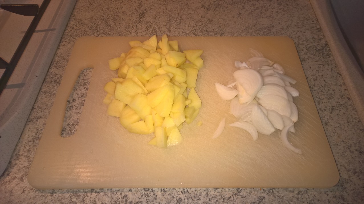 - Prendete le patate e la cipolla e privatele della buccia. Tagliate le patate a dadini e la cipolla grossolanamente alla julienne. Fate sbollentare le patate in acqua bollente salata per circa 5 minuti.