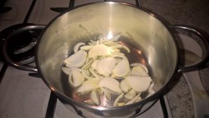 - In una pentola mettette a soffriggere l’olio extravergine d’oliva con al cipolla.