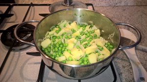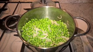 - Quando la cipolla sarà ben dorata, aggiungete i piselli e fate insaporire per circa 3 minuti.