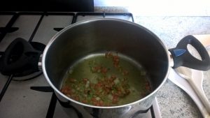 - In una pentola, abbastanza capiente, mettete a soffriggere nell’olio extravergine d’oliva la cipolla e la carota tritata e fate imbiondire.