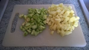 - Prendete la zucchina trombetta e le patate. Lavatele, privatele della buccia e tagliatele a dadini abbastanza piccoli in modo da far cuocere il tutto più facilmente.