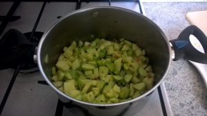 - Quando il soffritto sarà pronto aggiungete la zucchina trombetta e le patate. Fate insaporire il tutto per circa 5 minuti.