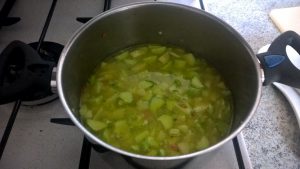 - Aggiungete il brodo fino a coprire la dadolata, e continuate la cottura per circa 15 minuti coprendo con un coperchio.
