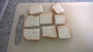- Prendete due fette di pane in cassetta e tagliatele in quattro parti.