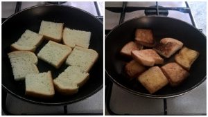 - Fate scaldare in una padellina un paio di cucchiai di olio extravergine d’oliva e fate dorare il pane prima da un lato e poi dall’altro. Ci vorranno pochissimi minuti.