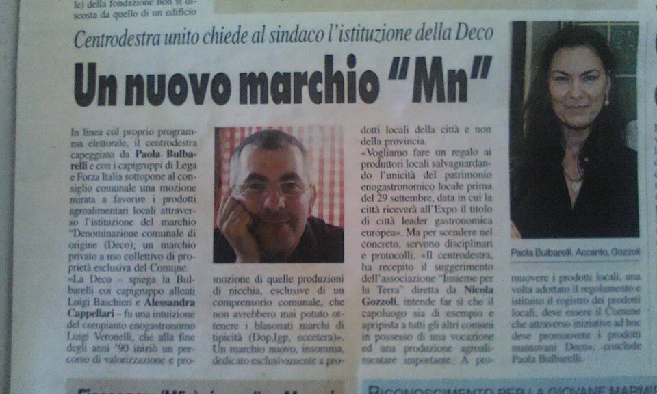 Coerentemente con il programma elettorale del centro-destra mantovano, presentato ai cittadini durante la recente campagna elettorale, i gruppi consiliari lista civica Paola Bulbarelli e’, Lega Nord e Forza Italia sottopongono all’attenzione del Consiglio Comunale una mozione per favorire i prodotti agroalimentari locali attraverso l’istituzione del marchio De.C.O. (Denominazione Comunale di Origine). Quest’ultimo è definibile come un marchio privato ad uso collettivo di proprietà esclusiva del Comune. Il De.C.O. fu una intuizione del noto e compianto enogastronomo e giornalista Luigi Veronelli, che alla fine degli anni ’90 iniziò un percorso di valorizzazione e promozione di quelle produzioni di nicchia, esclusive di un comprensorio comunale, che non avrebbero mai potuto ottenere i blasonati marchi di tipicità (DOP,IGP, etc.).