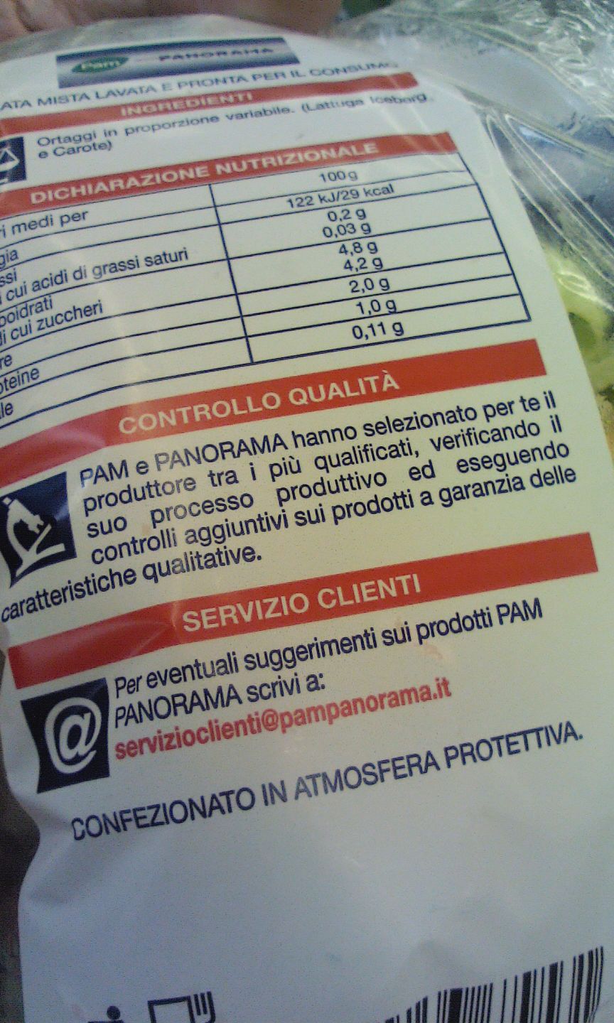 Dalle insalate ai fagioli a marchio Pam Panorama non vi è presente nessuna dicitura e/o simbolo che faccia capire se questi prodotti siano italiani. Addirittura sulla parte riferita alla qualità posta sul retro della confezione la trattazione dell’origine italiana del prodotto è totalmente ignorata.