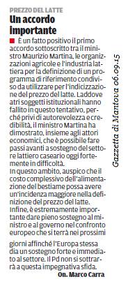 In una Lettera al Direttore pubblicata sulla Gazzetta di Mantova, quotidiano più antico d’Italia, l’On. Marco Carra, componente della Commissione Agricoltura della Camera dei Deputati, ha accolto la nostra proposta tanto da dichiarare “… auspico che il costo complessivo dell’alimentazione del bestiame possa avere un’incidenza maggiore nella definizione del prezzo del latte …”.