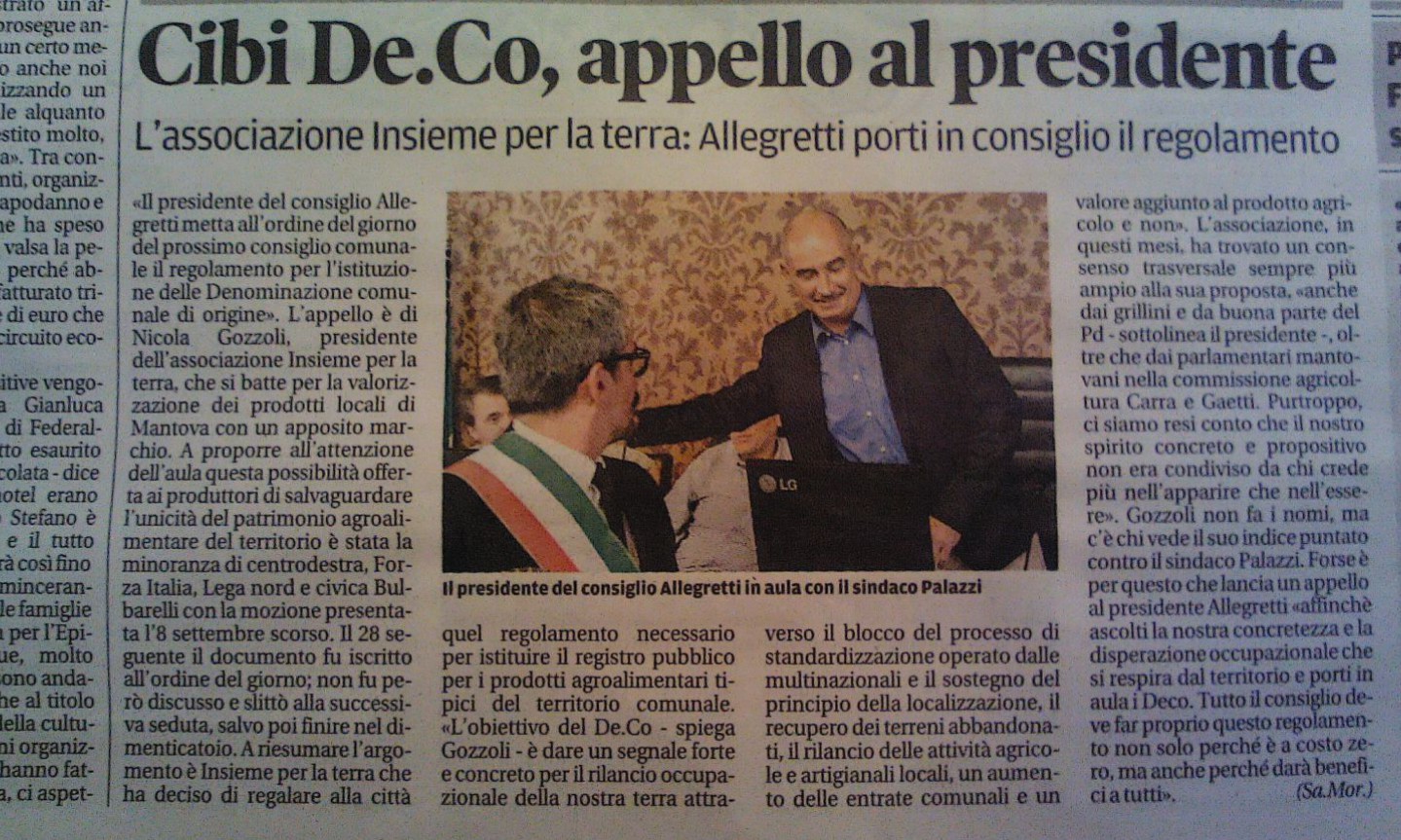 Come a rievocare un vecchio film in bianco e nero di Don Camillo e Peppone, nella capitale dell’agroalimentare europea e capitale della cultura anno 2016 si è scatenata una vera e propria battaglia sul rilancio dell’occupazione locale attraverso il Regolamento De.C.O. presentato dal nostro Presidente. Riportiamo l’articolo apparso ieri 4 gennaio sulla Gazzetta di Mantova, quotidiano più antico d’Italia. “Il presidente del consiglio Allegretti metta all’ordine del giorno del prossimo consiglio comunale il regolamento per l’istituzione della Denominazione Comunale di Origine”. L’appello è di Nicola Gozzoli, Presidente dell’associazione Insieme per la Terra, che si batte per la valorizzazione dei prodotti locali di Mantova con un apposito marchio. A proporre all’attenzione dell’aula questa possibilità offerta ai produttori di salvaguardare l’unicità del patrimonio agroalimentare del territorio è stata la minoranza di centrodestra, Forza Italia, Lega Nord e Civica Bulbarelli con la mozione presentata l’8 settembre scorso. Il 28 settembre il documento fu…