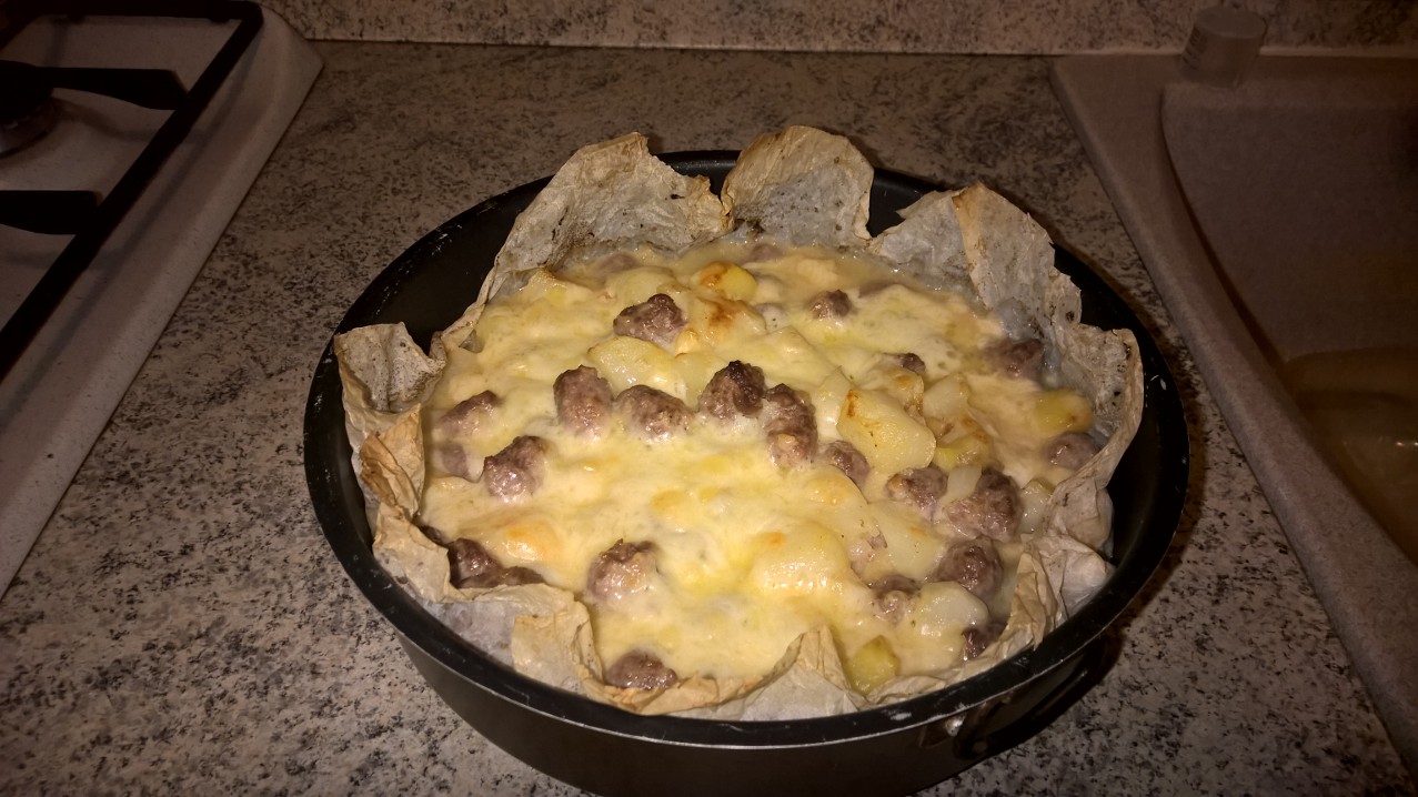 Secondi piatti PASTICCIO DI PATATE, SALSICCIA E CACIOCAVALLO CALABRO Introduzione Oggi la temperatura si è abbassata e il freddo inverno ha bussato alla mia porta. ed io per tutta risposta ho acceso il forno e ho messo in teglia un meraviglioso pasticcio con il signor Caciocavallo calabro. Volete provare? Tempo di preparazione : 10 minuti Tempo di cottura: circa 1 ora Ingredienti  650 gr. di patate 500 gr. di salsiccia 250 gr. di Caciocavallo calabro 1/2 bicchiere di vino bianco 2 spicchi d’agio senza camicia q.b. di sale fino q.b. di olio extravergine d’oliva Preparazione Accendiamo il forno a 200°. Prendiamo le patate, le sbucciamo e le tagliamo a cubi medio grandi.  Prendiamo la carta forno, la bagniamo con l’acqua e la strizziamo per eliminare l’acqua in eccesso. Prendiamo una teglia abbastanza grande (io ho usato un diametro 26) e la foderiamo con la carta forno. Versiamo le patate nella teglia, ci aggiungiamo i 2…