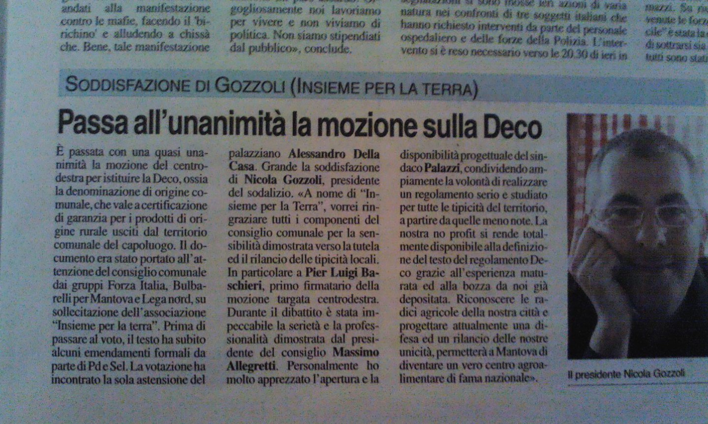 Dopo mesi di intenso lavoro la forza ed il coraggio nella difesa del territorio è finalmente stata riconosciuta. Siamo nella Capitale della Cultura Italiana 2016 nonchè Capitale Gastronomica Europea 2017: Mantova, perla del rinascimento italiano. La mozione, con carattere urgente, presentata in Consiglio Comunale da tutto il centrodestra mantovano, che voleva l’istituzione di un Regolamento De.C.O. per la tutela di tutte le tipicità locali, partendo da quelle agroalimentari, è stata approvata con 28 SI e un astenuto. Nessun voto contrario. La posizione degli otto sottoscrittori della mozione è stata illustrata a inizio dibattito dal primo firmatario Dr. Pierluigi Baschieri; ne è seguito un intenso e costruttivo dibattito con tutti i partiti e liste civiche presenti in Consiglio Comunale. Durante il Consiglio sono state presentate quattro emendamenti alla mozione in discussione. I primi due sono stati ritirati mentre i rimanenti, a firma PD e SEL, sono stati approvati e condivisi a…